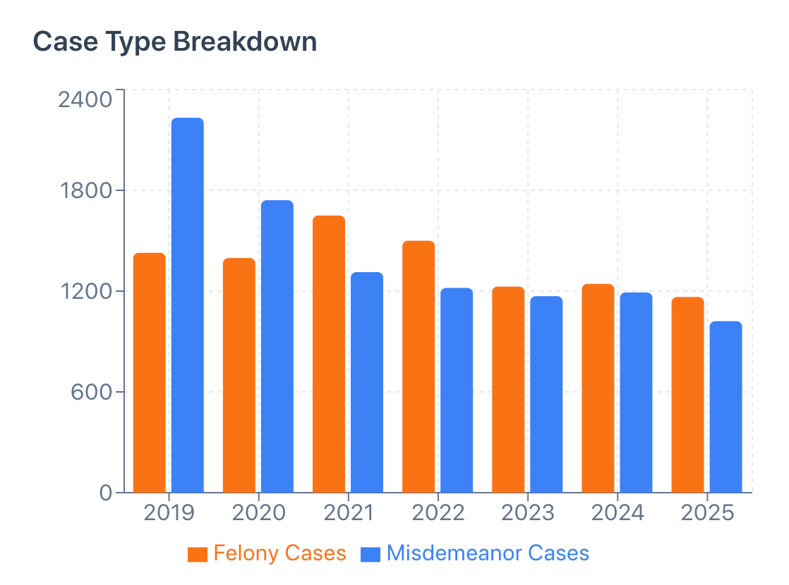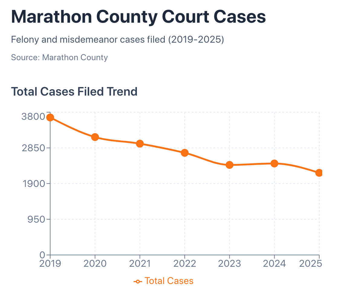 The same trend emerged. In 2019, there were 1,428 felony cases filed in Marathon County Court. By the end of 2025, there were 1,165. Same with misdemeanor cases, except there was an even sharper drop. In 2019, there were 2,232 misdemeanor cases filed.